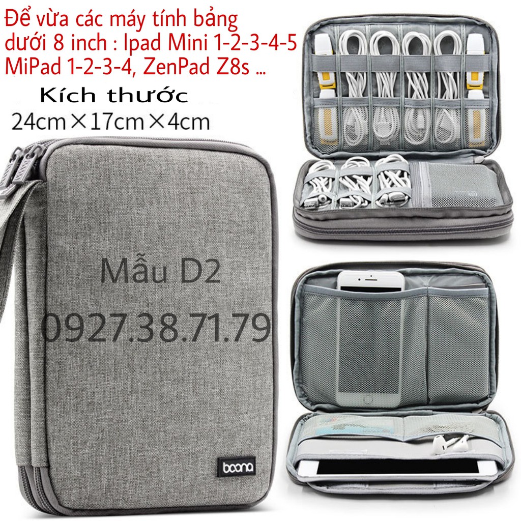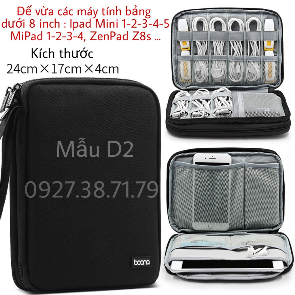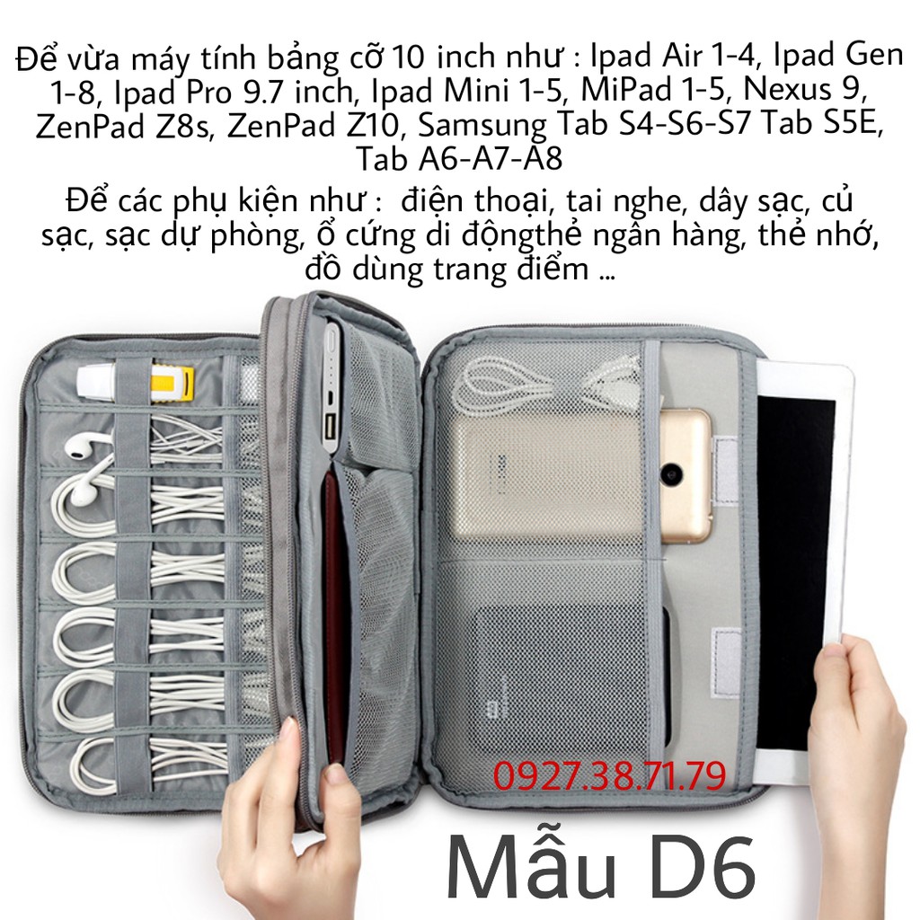3. Túi BOONA D6 (Size L to) để vừa máy tính bảng cỡ 10 inch như : Ipad Air 1-4, Ipad Gen 1-8, Ipad Pro 9.7 inch, Ipad Mini 1-5, MiPad 1-5, Nexus 9, ZenPad Z8s, ZenPad Z10, Samsung Tab S4-S6-S7 Tab S5E, Tab A6-A7-A8 ....và các phụ kiện như : điện thoại, tai nghe, dây sạc, củ sạc, sạc dự phòng, ổ cứng di độngthẻ ngân hàng, thẻ nhớ, đồ dùng trang điểm ...