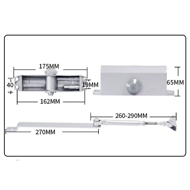 Tay co thủy lực dành cho cửa 25kg đến 55kg có điểm dừng.Tay co thủy lực(tay đẩy hơi) là thiết bị giúp đóng cửa tự động. Khi cửa mở, lực lò xo của tay co sẽ kéo cánh cửa vào và đóng lại một cách tự động, tạo sự thoải mái, tiện lợi cho con người. Điều này giúp cho cửa luôn duy trì trạng thái đóng, nhờ đó hệ thống cửa được bảo vệ tốt hơn, chống va đập khi có gió lùa.Tay co thủy lực thường được lắp đặt cho các phòng kỹ thuật, phòng lãnh đạo, nhà chung cư… Cửa được lắp tay co giúp chống ồn, chống va đập, bảo vệ tính riêng tư, ngăn trẻ nhỏ hoặc chó mèo tự ý ra ngoài khi cửa vô tình mở.Một số nơi việc lắp tay co là bắt buộc như cửa thoát hiểm, cửa phòng kho, phòng kỹ thuật, trường học, bệnh viện
