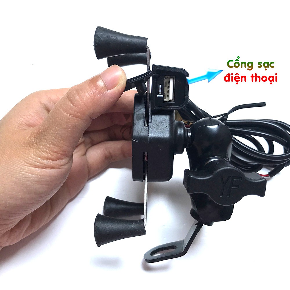 Chức năng: 2 TRONG 1,Phần khung thép chắc chắn và các cọc đệm cao su chống trơn, vừa làm giá đỡ điện thoại để anh em dễ dàng dùng các chức năng trong khi xe di chuyển, vừa có khe cắm sạc giúp điện thoại bạn luôn đầy pin dù ở bất cứ nơi đâu.
