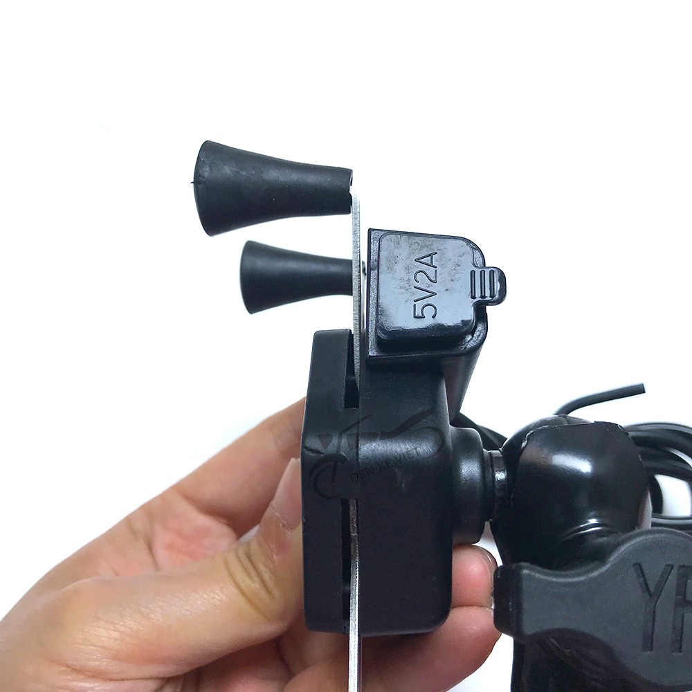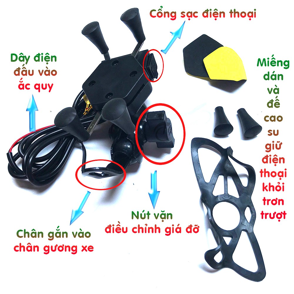 Cách sử dụng: Anh em gắn chiếc giá đỡ vào phần chân gương xe máy, vặn núm điều chỉnh góc quay 360 độ thích hợp cho giá đỡ về phía anh em tiện sử dụng nhất. Còn Phần dây điện thì kết nối với bình ắc quy.