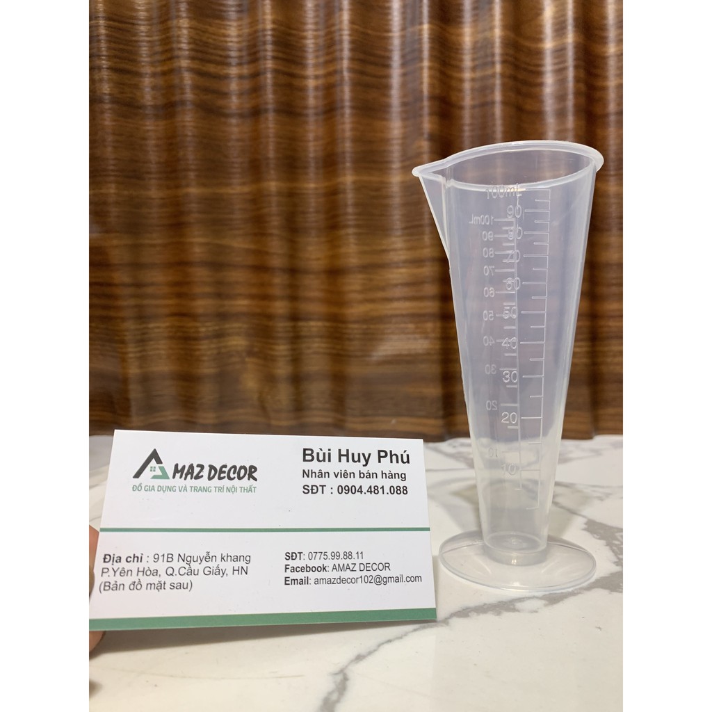 100ML (Hình nón): đường kính miệng trên 5.5CM, đế: 5CM; chiều cao 13.5CM