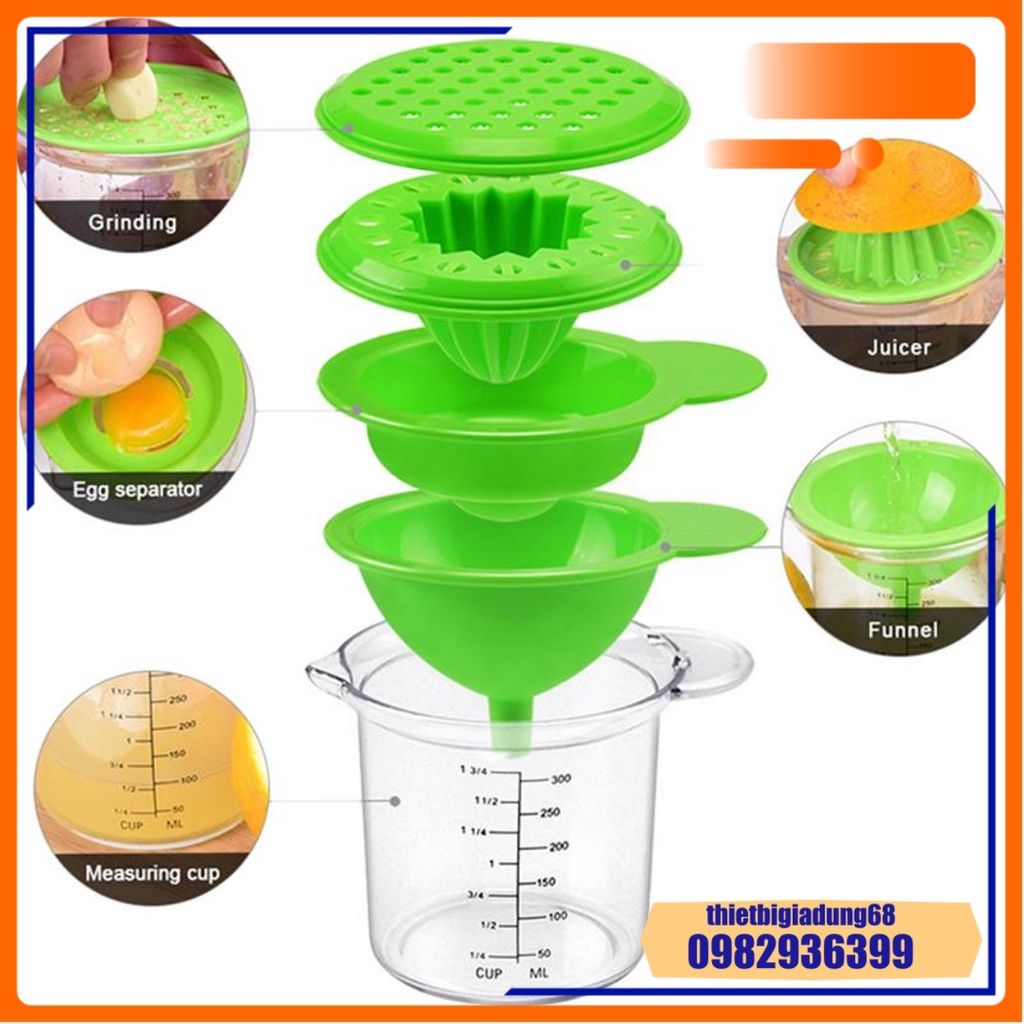Giới thiệu Cốc Chia Vạch Nhà Bếp Đa Năng 300ml 5in1 Định Lượng, Vắt Cam, Lọc Trứng, Phễu Lọc, Mài Rau Củ Quả, Dụng Cụ Nhà Bếp