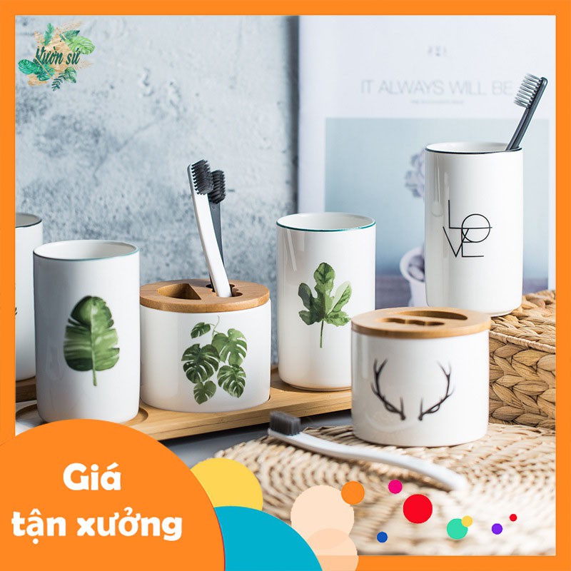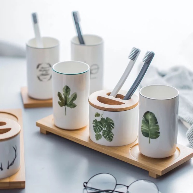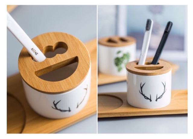 Nhà Cửa & Đời Sống > Đồ dùng phòng tắm > Kệ để đồ phòng tắm || Bộ cốc đánh răng sứ kèm khay gỗ (4 mẫu ) cao cấp HÀNG SẴN - VS51Còn hàng