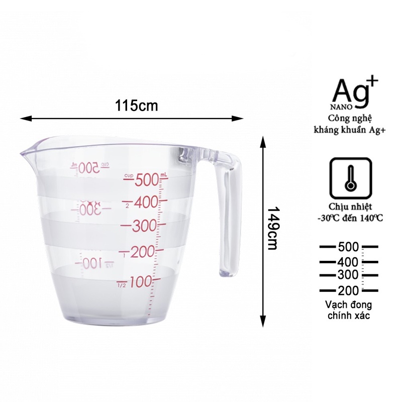 - Cốc có chia vạch giúp định lượng chính xác, phần đầu được thiết kế nhọn giúp rót, đổ dễ dàng