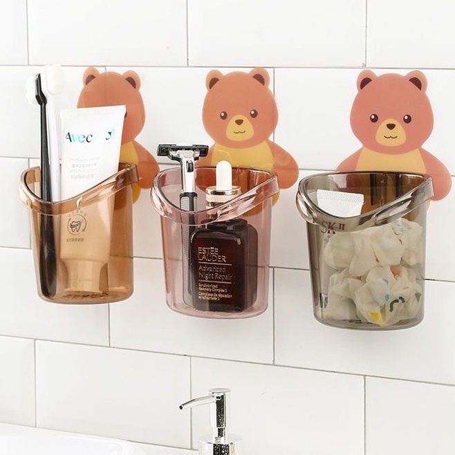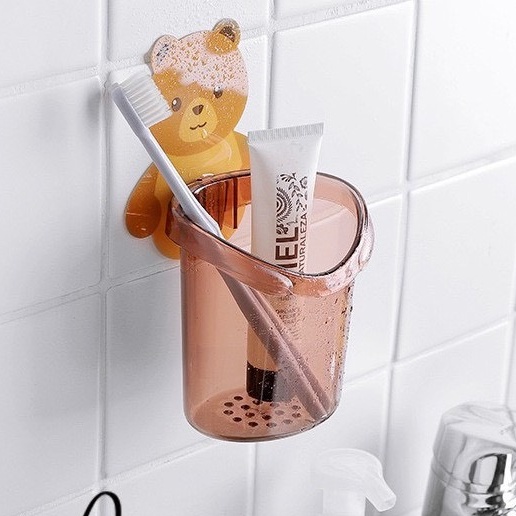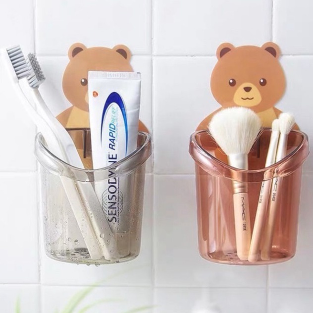 Cốc gấu dán tường để bàn chải đánh răng, đồ dùng vệ sinh cá nhân có lỗ thoát nước tiện lợi