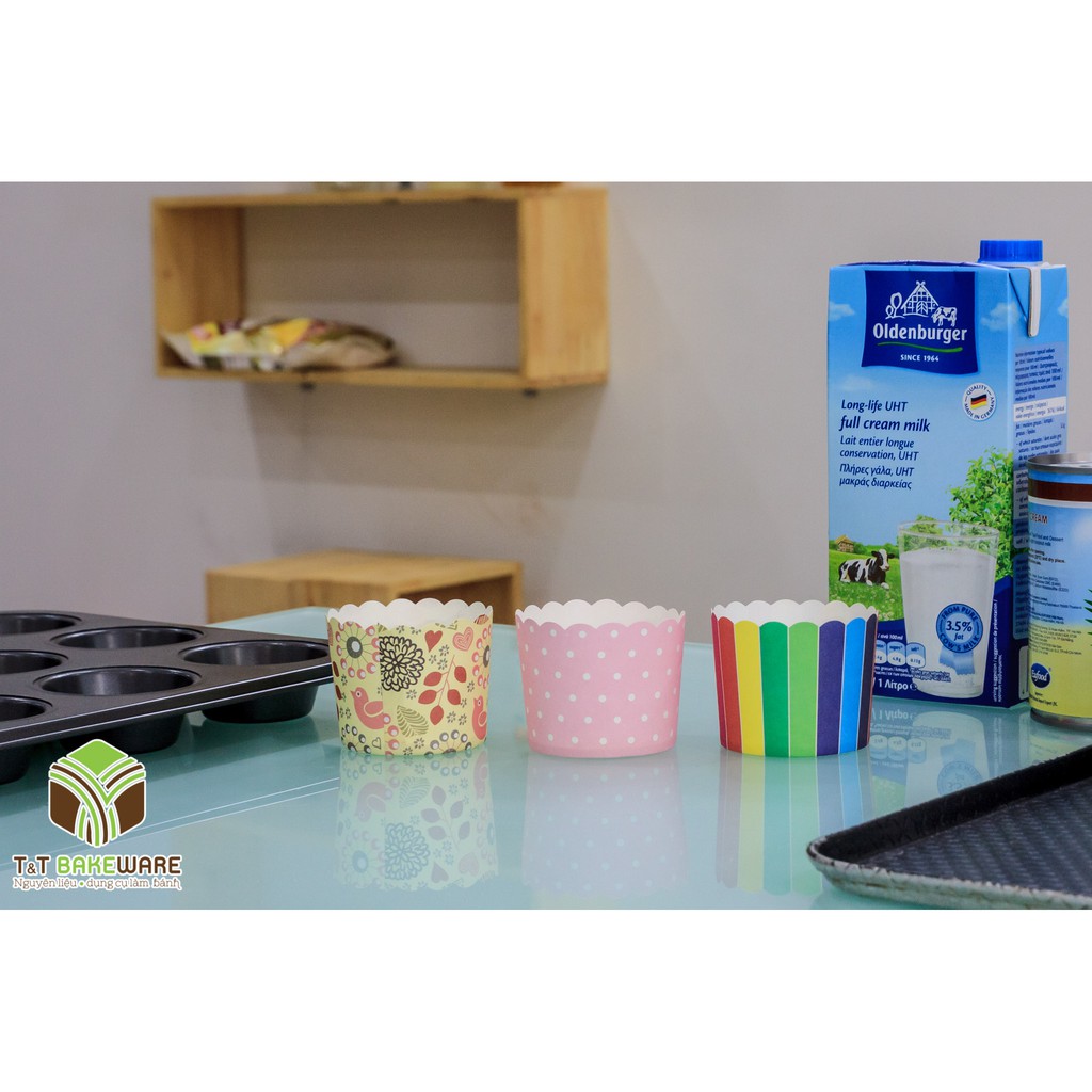 - Cup cứng cỡ lớn đáy tròn với hoa văn trang trí đẹp mắt giúp những chiếc bánh trở nên vô cùng xinh xắn, thuận tiện để cầm nắm dễ dàng.