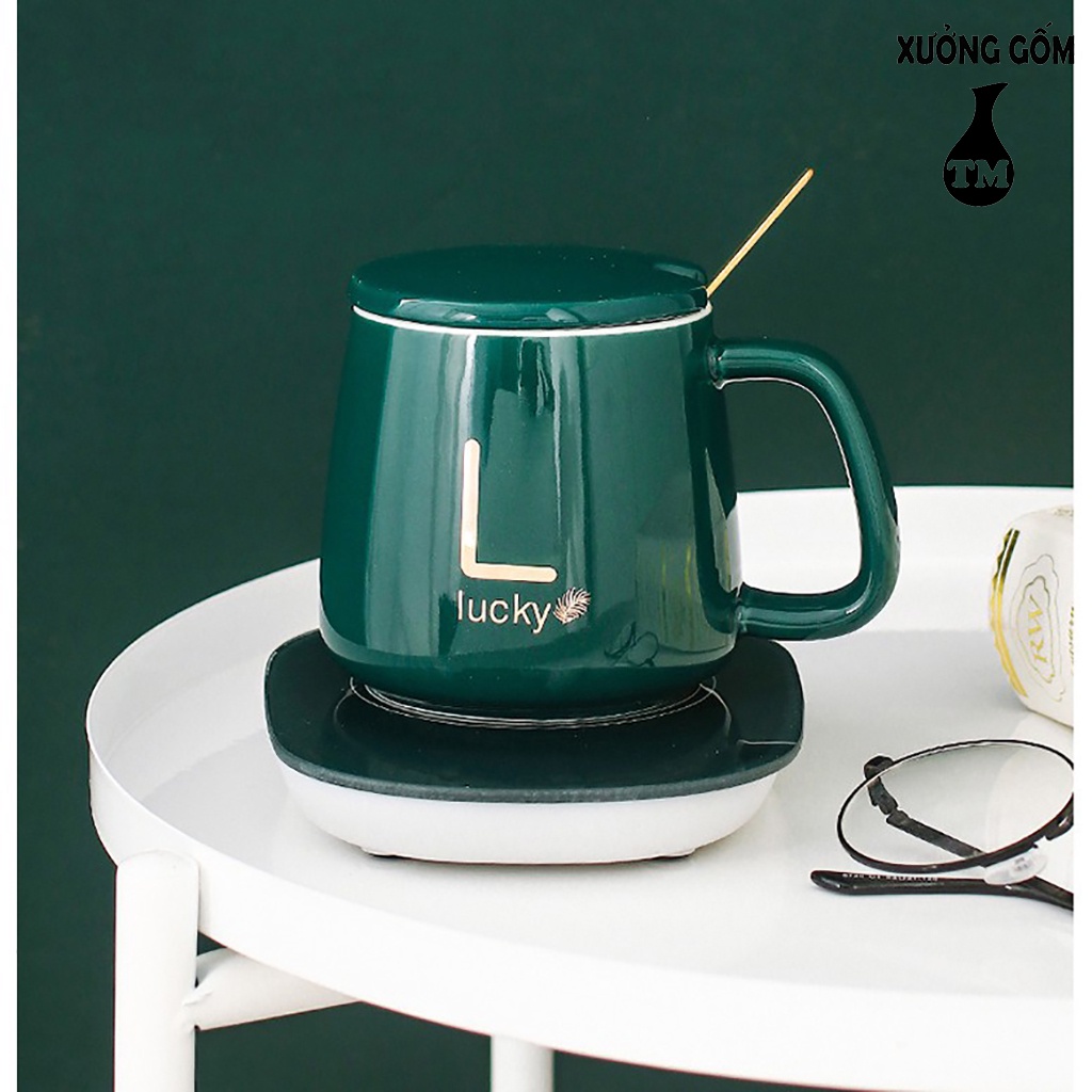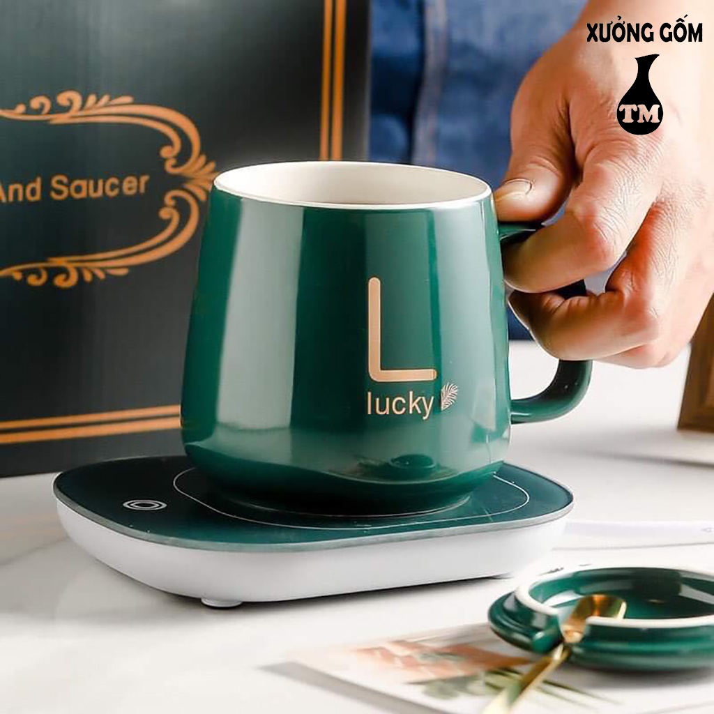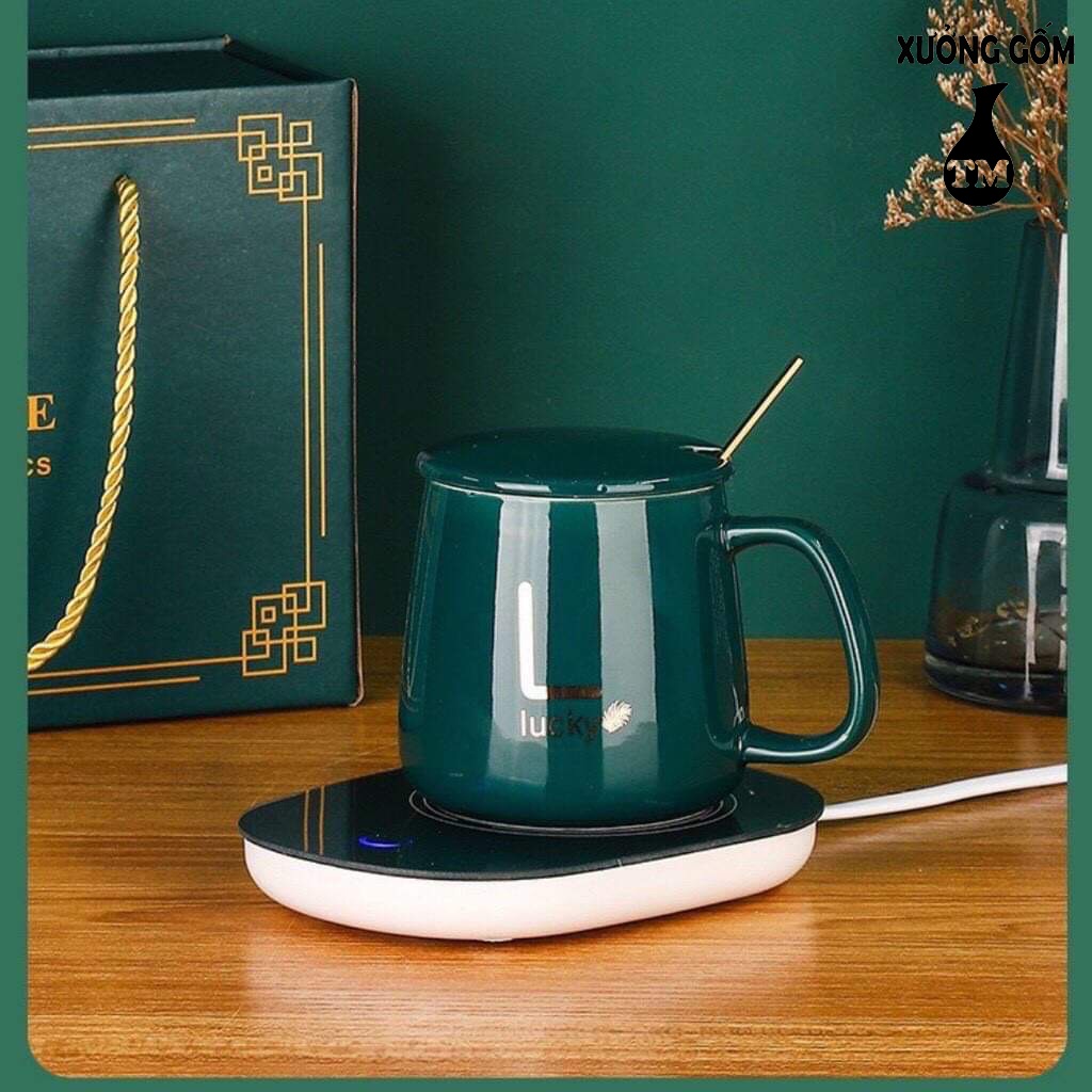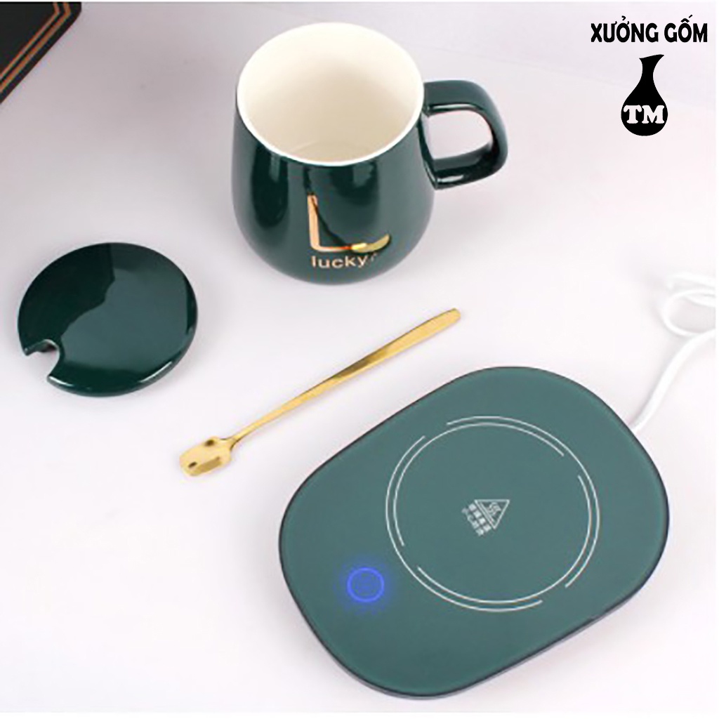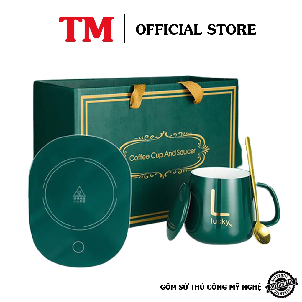 Bộ Cốc Giữ Nhiệt Hâm Nóng Đồ Uống Xưởng Gốm TM Bát Tràng Kèm Đế Điện + Tặng Thìa Vàng, Hộp Sang Trọng