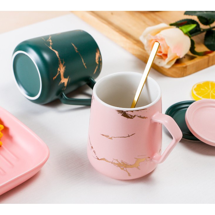 Cốc Gốm Sứ Có Nắp Vân Cẩm Thạch Dung Tích 400ml- Tặng Kèm Thìa