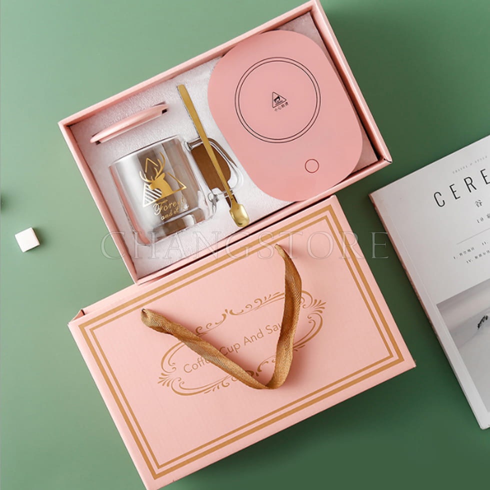 Cốc Hâm Nóng Bằng Thủy Tinh, Ly Thủy Tinh Kèm Đế Điện Hâm Nóng Cafe, Sữa, Trà + Tặng Thìa Mạ Vàng Tiện Lợi