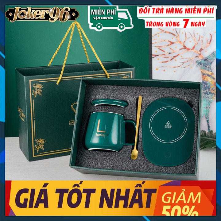 Bộ Cốc Ly Sứ Hâm Nóng Lucky Thông Minh Cao Cấp, Kèm Đế Điện Hâm Cafe, Sữa, Trà Tặng Kèm Thìa Mạ Vàng Tiện Lợi