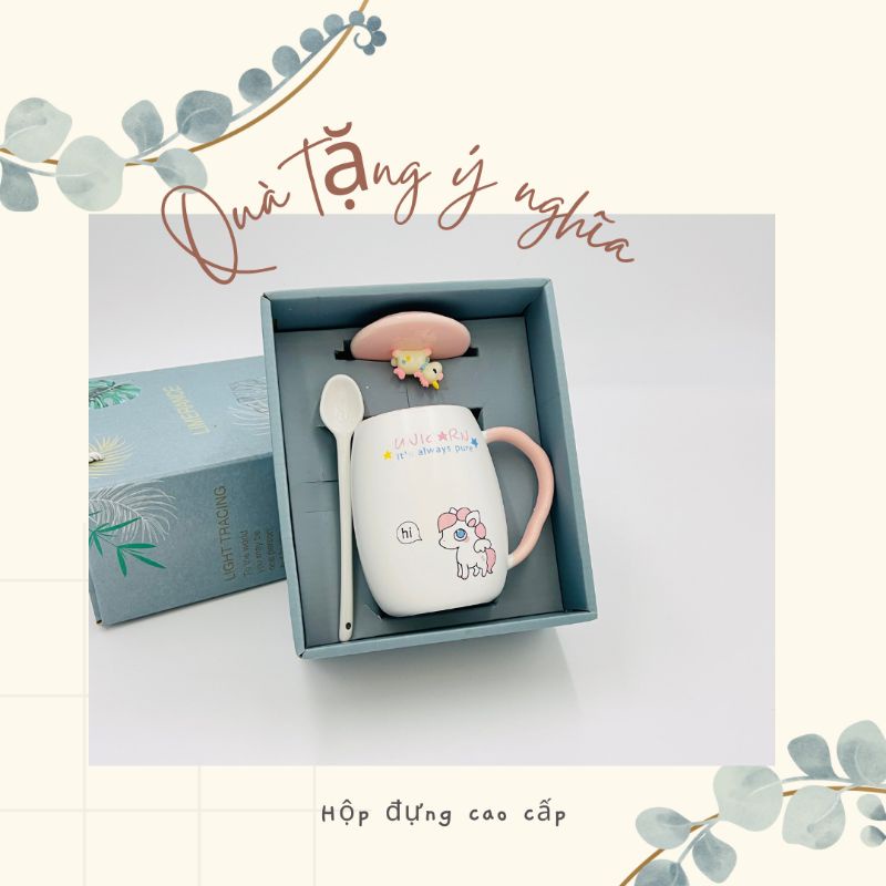 Cốc, ly sứ uống nước pha trà, cafe có nắp tặng kèm thìa họa tiết kỳ lân cute đáng yêu