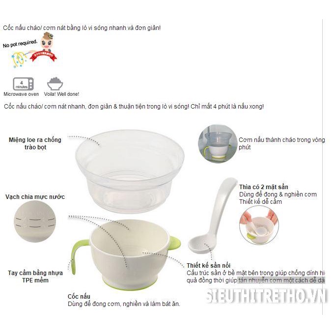 - 1 cốc đựng: làm từ nhựa PP không chứa BPA, có tay cầm, có vạch chia ml, dùng để đong nước, đáy cốc có các hạt sần để nghiền cơm nát dễ dàng. Cốc có thể sử dụng như một bát ăn bình thường cho bé.