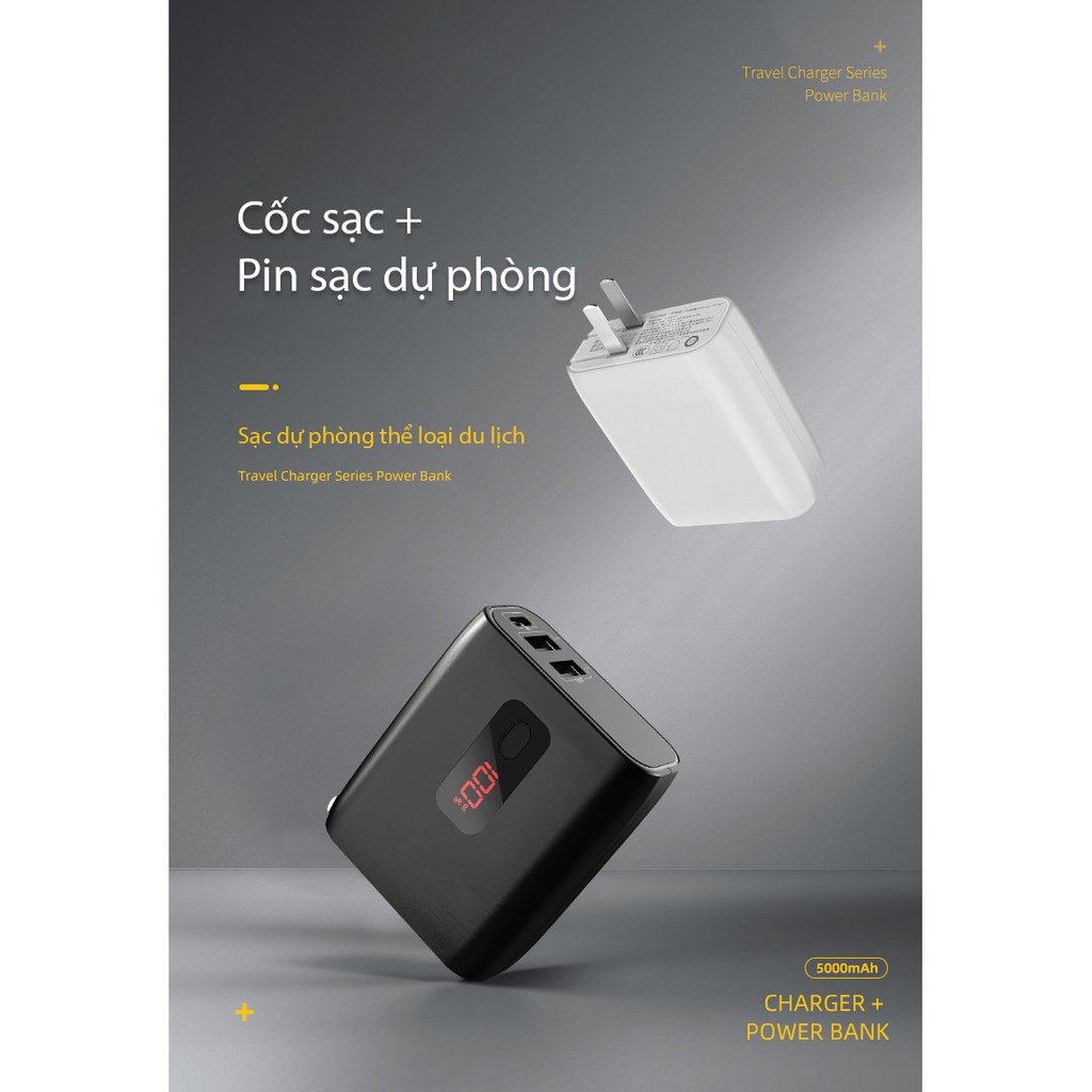 Cốc sạc kèm pin dự phòng HKL-USB55 2 IN 1 dung lượng 5000mAh 2 cổng USB có màn hình hiển thị nhỏ gọn di động