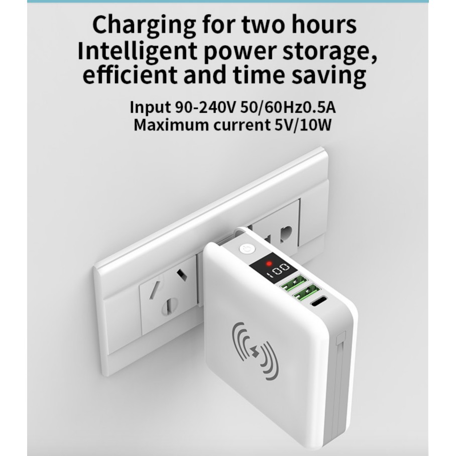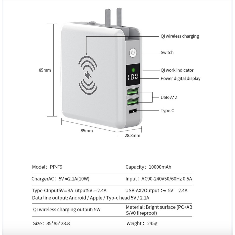 * Chuẩn đầu ra: USB 5V ~ 2.4A, công suất QI không dây là 5W Dung lượng pin: 10000mAh