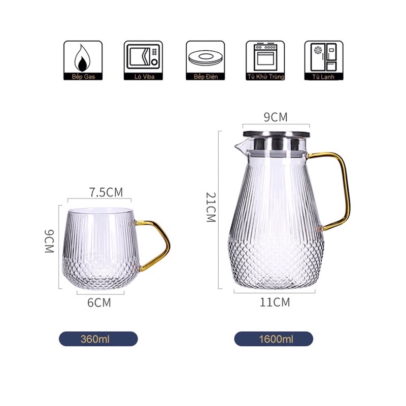 - Bình có thể tích 1.6L thủy tinh trong suốt, Ly thủy tinh 350ml, chịu nhiệt cao, bảo đảm an toàn vệ sinh.