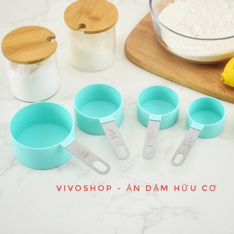 Bộ muỗng đo lường với 8 định lượng khác nhau sẽ vô cùng tiện dùng cho mẹ nấu nướng và làm bánh đấy ạ.✅ Bộ cốc đo lượng 4 mức: