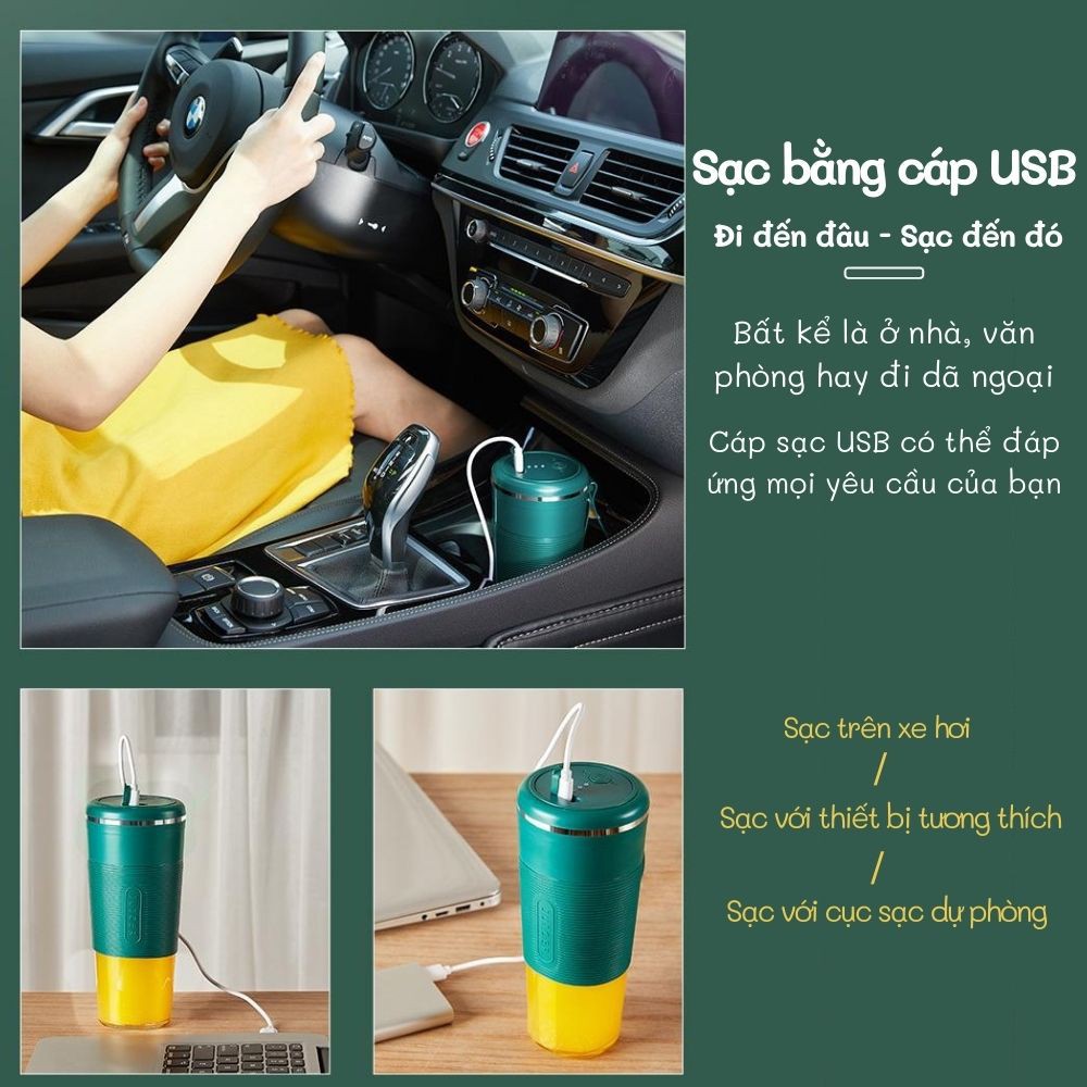 - Máy xay cầm tay sử dụng pin tích điện cáp xạc USB , bất kể ở nhà, văn phòng, trên xe hơi, xạc dự phòng , tương thích mọi thiết bị, Bạn và Gia Đình Đều Có Thể Chăm Sóc Sức Khỏe Của Mình Bất Cứ Lúc Nào với những đồ uống bổ dưỡng từ trái cây-Thiết kế cảm ứng từ trên nắp cốc ,tự động ngắt điện khi mở nắp , lưỡi dao ẩn , chỉ khi đóng chặt cốc máy mới bắt đầu hoạt động , An Toàn Tuyệt Đối Cho Bạn và Gia Đình Bạn