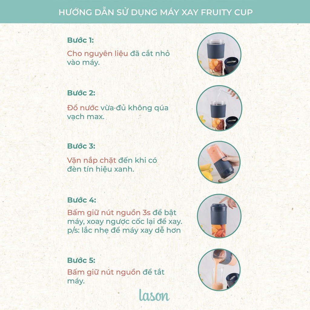 - Ảnh Cốc xay sinh tố sạc pin Fruity Cup của được đội ngũ Lason tự chụp 100%, đảm bảo mẫu mã như hình, có thể sai lệch về màu 1 chút do điều kiện ánh sáng chụp