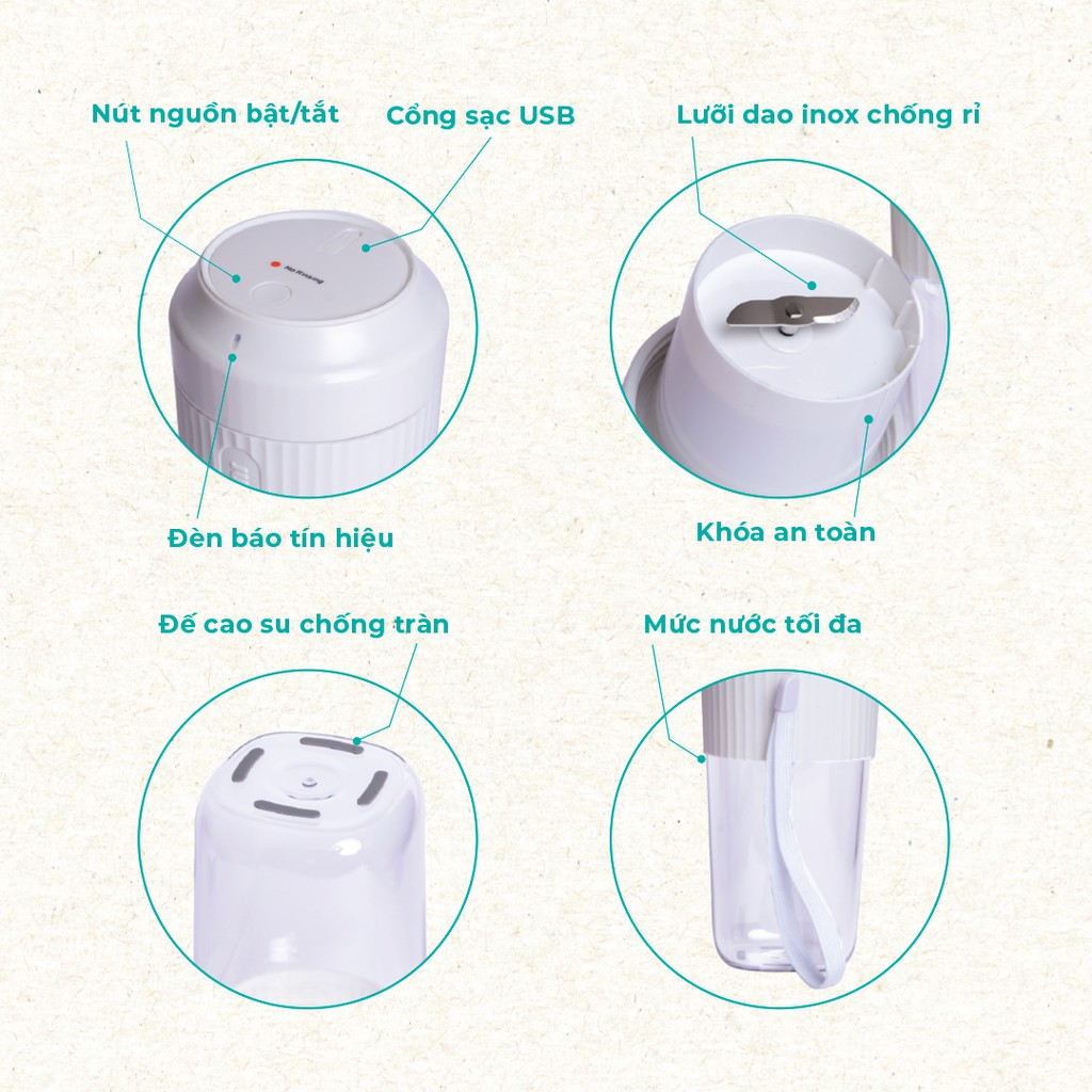 - Sử dụng pin sạc tiện lợi, 1 lần sạc có thể xay được 8-10 cốc