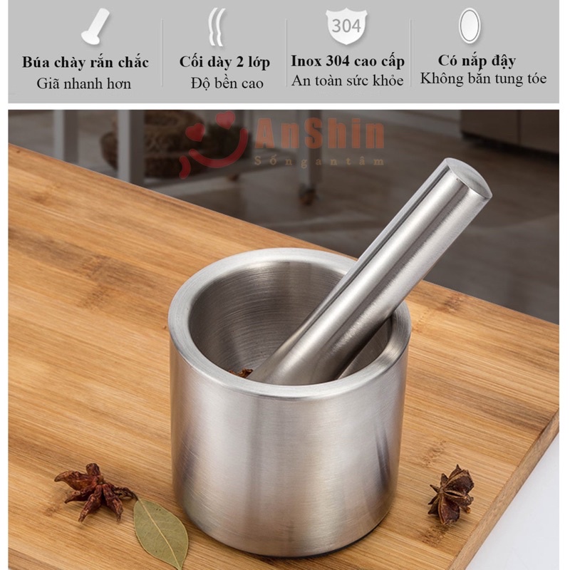 Nhà cửa & Đời sống > Dụng cụ nhà bếp > Bàn nạo, dụng cụ bào, cắt || Cối chày Inox 304 cao cấp AnShin hàng đúc liền khối không vết hàn (dáng trụ thẳng)Còn hàng