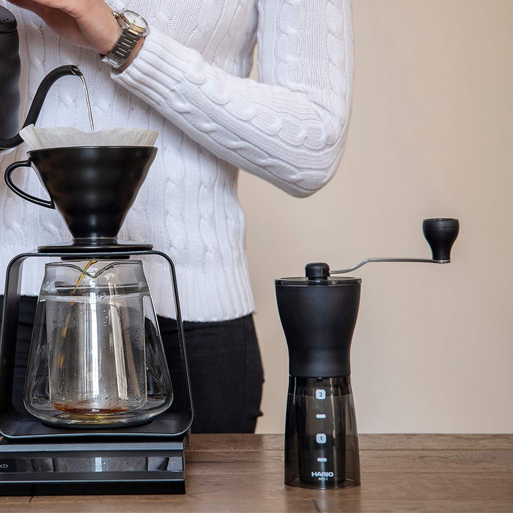 - Cối xay cà phê Hario sử dụng trục nghiền để nghiền nhỏ cà phê thành bột có kích cỡ đồng nhất để nước có thể chiết xuất được mùi vị một cách đồng bộ. Kích cỡ bột không đồng nhất có nghĩa là quá nhiều mùi vị được trích xuất từ bột mịn, dẫn đến cà phê bị đắng, trong khi quá ít mùi vị được trích xuất từ bột thô, khiến cà phê chảy nhanh và hương vị bị nhạt.