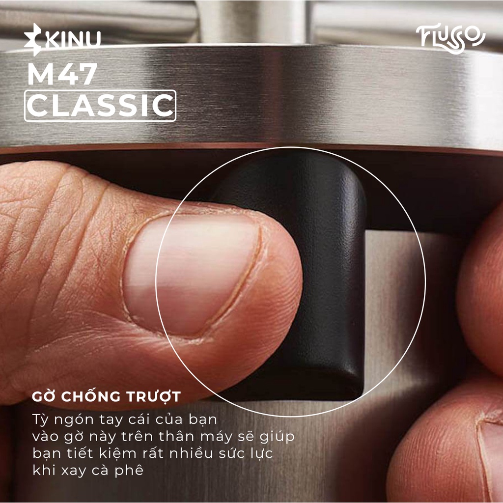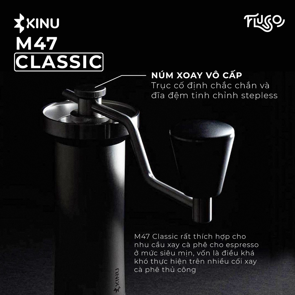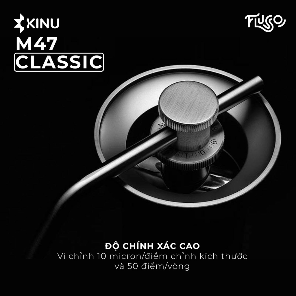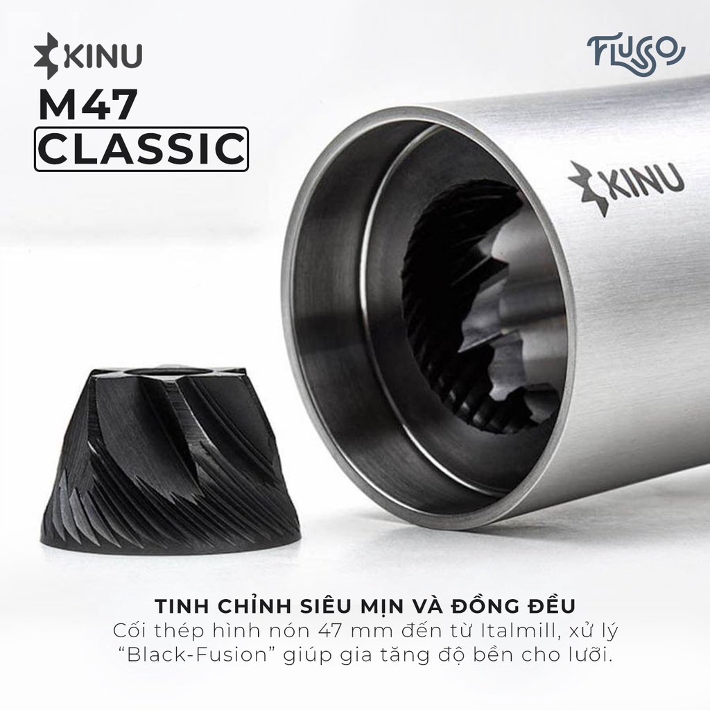 Cối Kinu M47 Classic được trang bị bộ lưỡi xay 47mm bằng thép không gỉ và được xử lý Black-Fusion giúp gia tăng độ bền cho lưỡi. Cơ chế stepless cho khả năng tinh chỉnh “vô hạn” lên tới 10 micro/1 click và 50 click/1 vòng. Với ưu điểm này, M47 Classic đặc biệt thích hợp cho nhu cầu xay cà phê cho espresso ở mức siêu mịn, vốn là điều khá khó thực hiện trên nhiều cối xay cà phê thủ công.