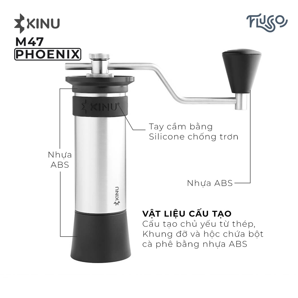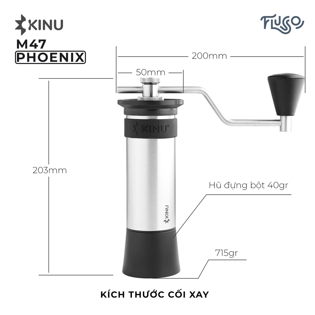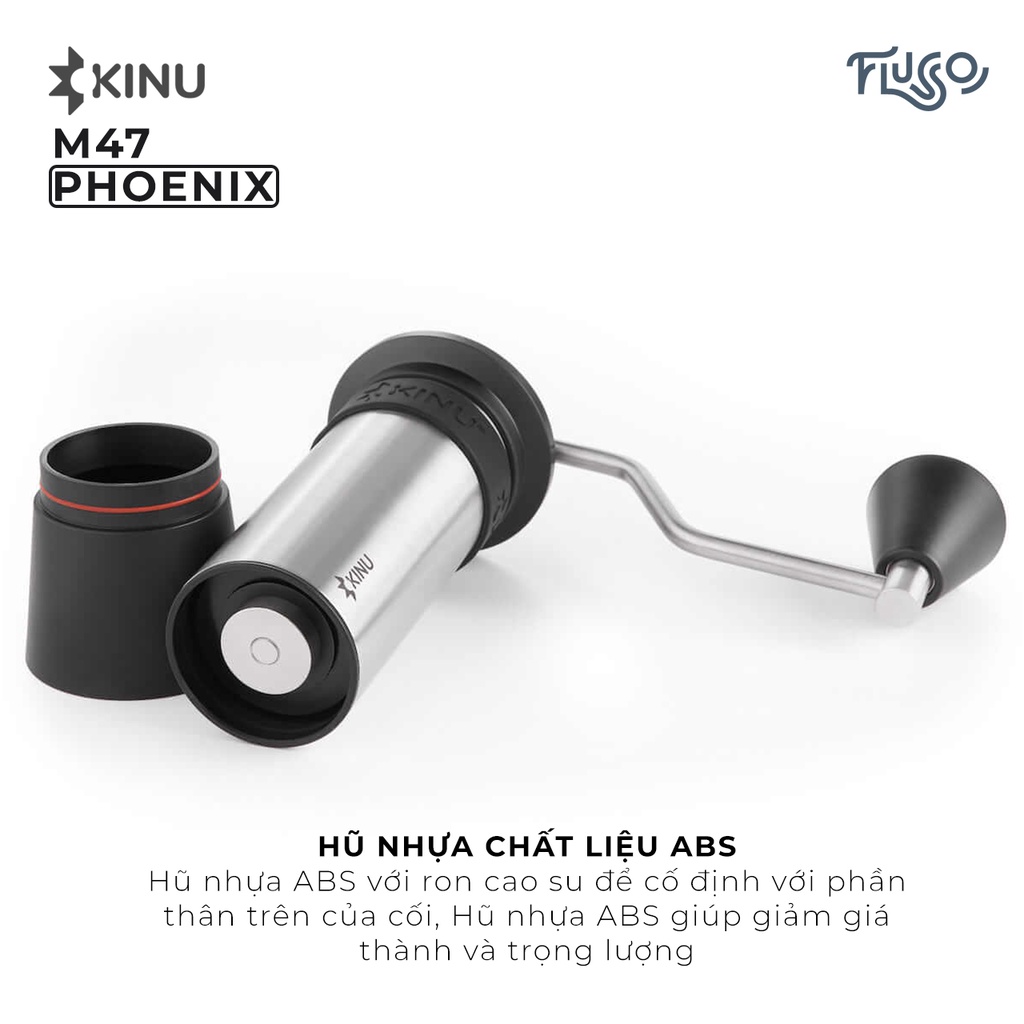 - Cối xay cà phê thủ công Kinu M47 Phoenix là sản phẩm đánh dấu sự trở lại của thương hiệu Kinu sau một sự cố cháy xưởng. Sau thành công của phiên bản Kinu M47 Classic, thiết kế lần này của Phoenix đã giảm bớt các chi tiết bằng thép, thay vào đó là khung cối và hộc đựng bột được làm bằng nhựa ABS an toàn cho thực phẩm. Sự thay đổi về chất liệu này cho cối xay Kinu M47 Phoenix một khối lượng nhẹ nhất trong số các dòng cối, giúp thao tác sử dụng trở nên nhẹ nhàng và tiện lợi hơn nếu phải di chuyển qua lại. Nhờ thiết kế “thân thiện” này mà Kinu M47 Phoenix hiện đang là phiên bản cối xay cà phê thủ công bán chạy nhất của hãng