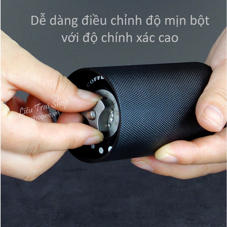 Cối xay cà phê lõi thép 6 cánh thế hệ 2 CNC pha moka pourover esspresoCối toàn thân bằng nhôm , lõi thép SU420 cắt CNC chính xác cao, có nút vặn điều chính độ mịn bột ca phê phía dưới