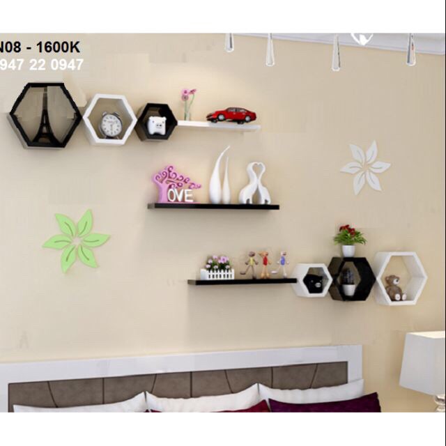 Com bo kệ gồm 6 ô lục giác và 3 thanh ngang- Chất liệu: Gỗ MDF nhập khẩu loại tốt
