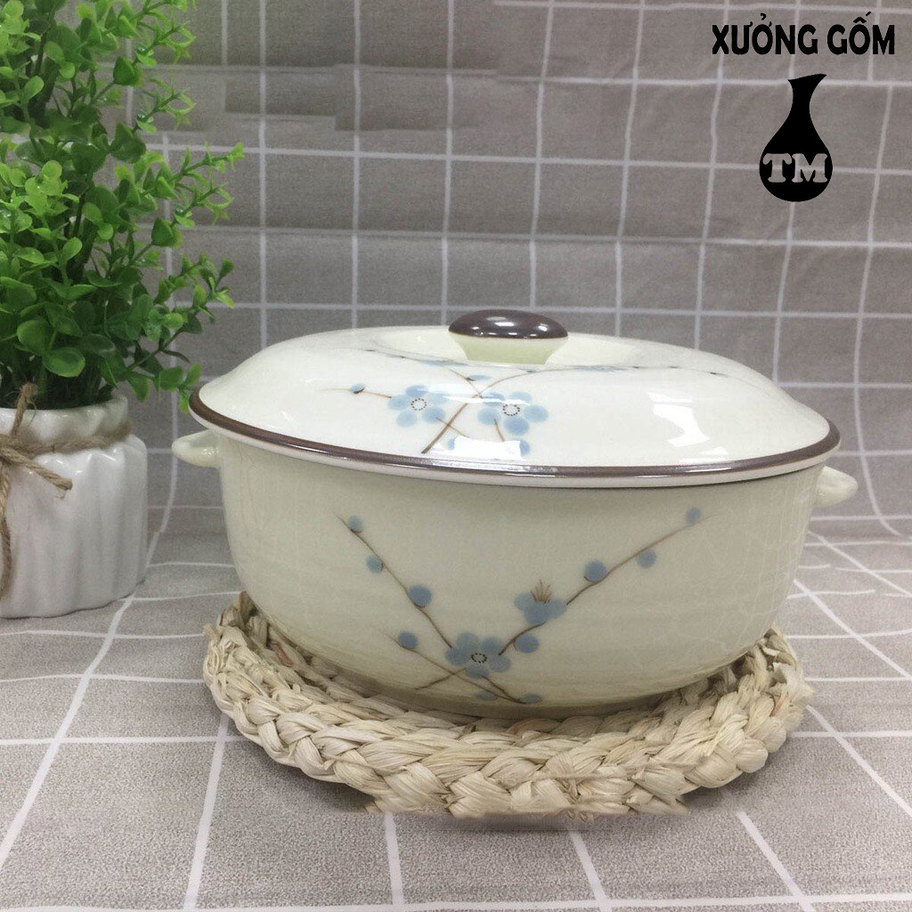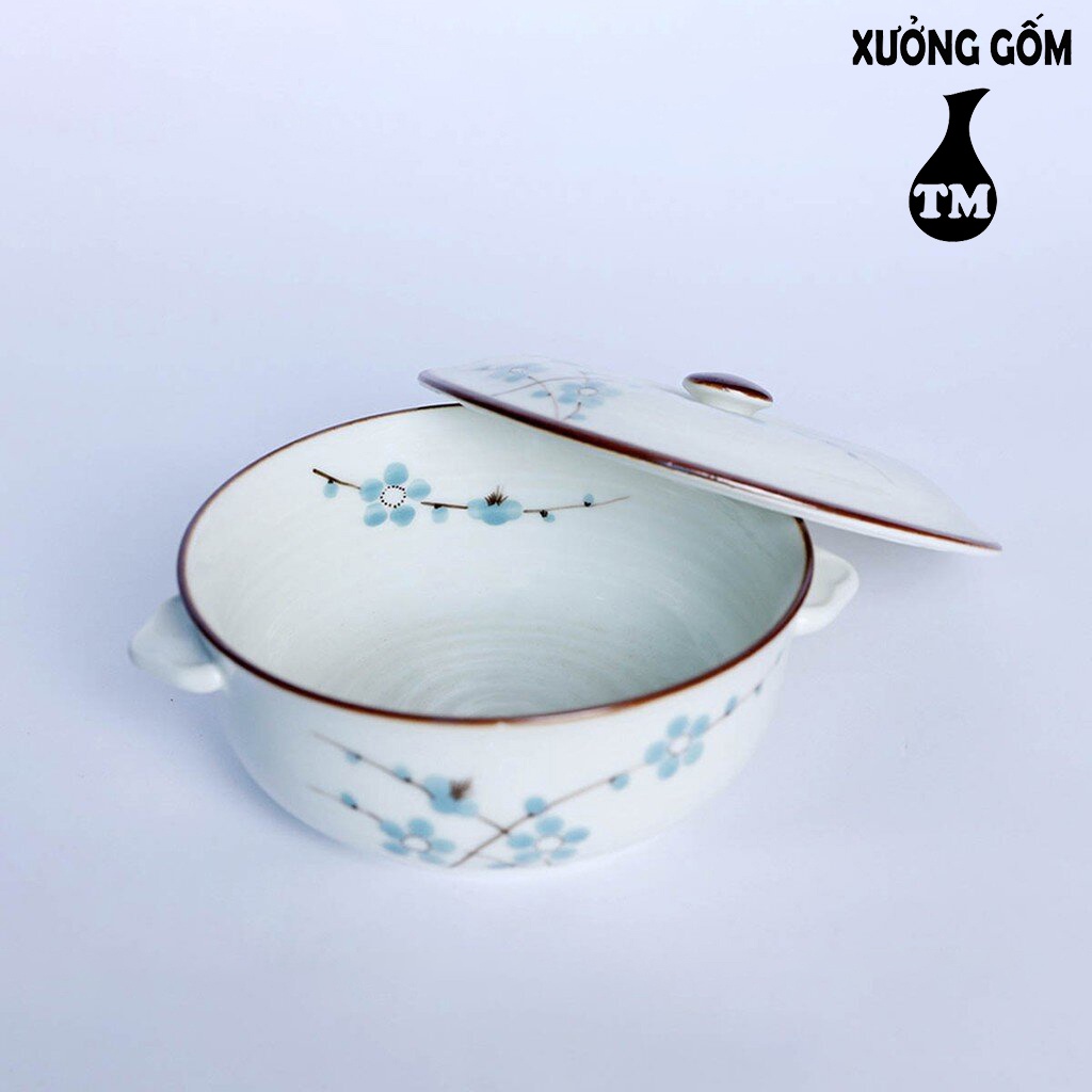 Combo 02 Bát Tô Âu Đựng Cơm Canh Xưởng Gốm TM Bát Tràng Mẫu Men Kem Vẽ Hoa Có Nắp