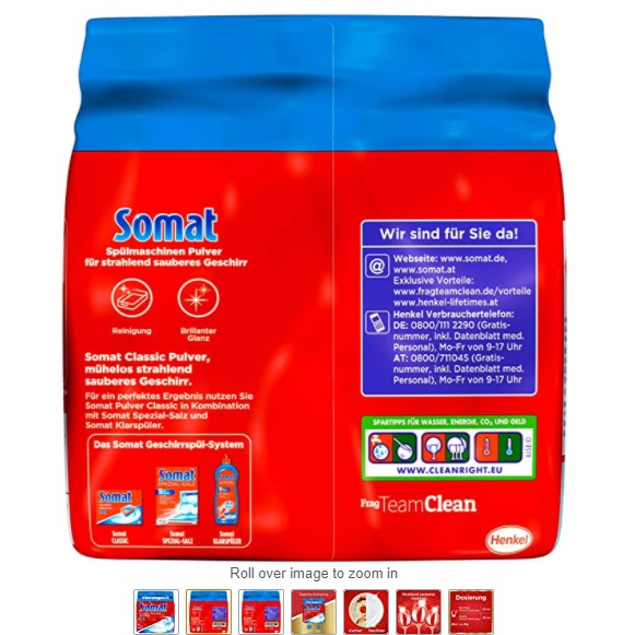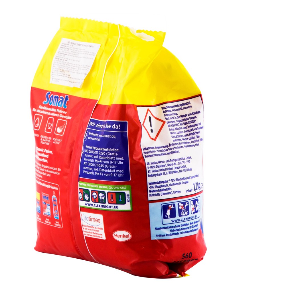 Bột rửa bát Somat được sản xuất tại Đức, là sản phẩm chuyên dụng phù hợp với các loại máy rửa bát như Malloca, Ariston, Fagor, Elextrolux…Bột rửa bát somat 1.2kg làm mềm nguồn nước cứng và một số ion kim loại có trong nước.Làm mềm nước, Giảm độ cứng của nước. Đảm bảo an toàn vệ sinh diệt khuẩn. Dành cho các loại máy rửa bát chuyên dụng và cao cấp. Sản xuất tại CHLB- ĐỨC Đạt các chứng nhận tiêu chuẩn EC trong việc xử lý nguồn nước giúp máy rửa bát hoạt động luôn tốt và luôn được bảo vệ trước các tác hại của các ion tự do các canxi magie có trong nguồn nước.Bột rửa bát Somat có Hợp chất tẩy rửa chuyên dụng chỉ dành cho Máy rửa bát với công thức kháng bọt cao cấp được sấy khô bằng máy sấy cao tần 95%. Chất bảo quản, chất trung hòa và hương liệu và các thành phần khác lớn hơn 3 %.
