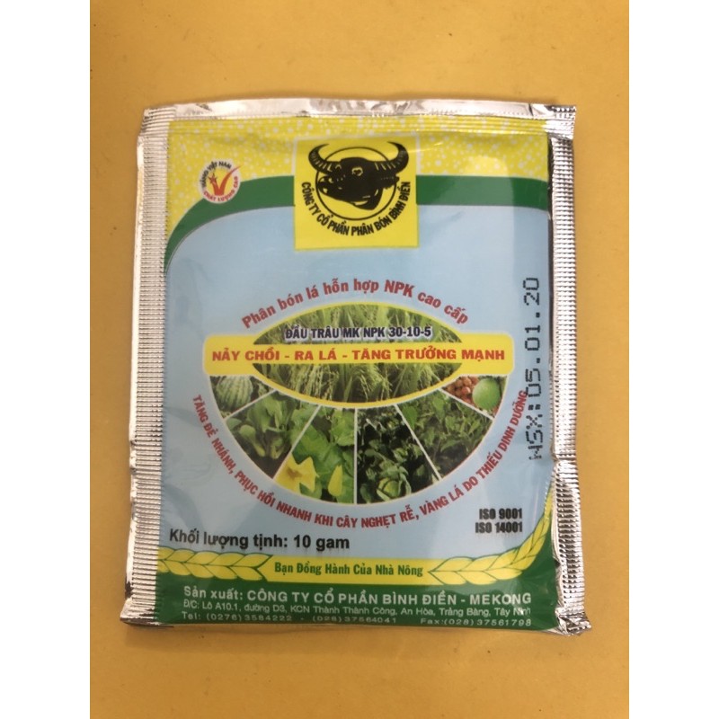 - Phân bón lá cao cấp Đầu Trâu MK 30-10-5 10g phù hợp dùng cho lúa, các loại cây cảnh, cây hoa và nhiều loại cây trồng khác.