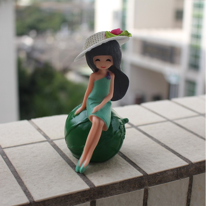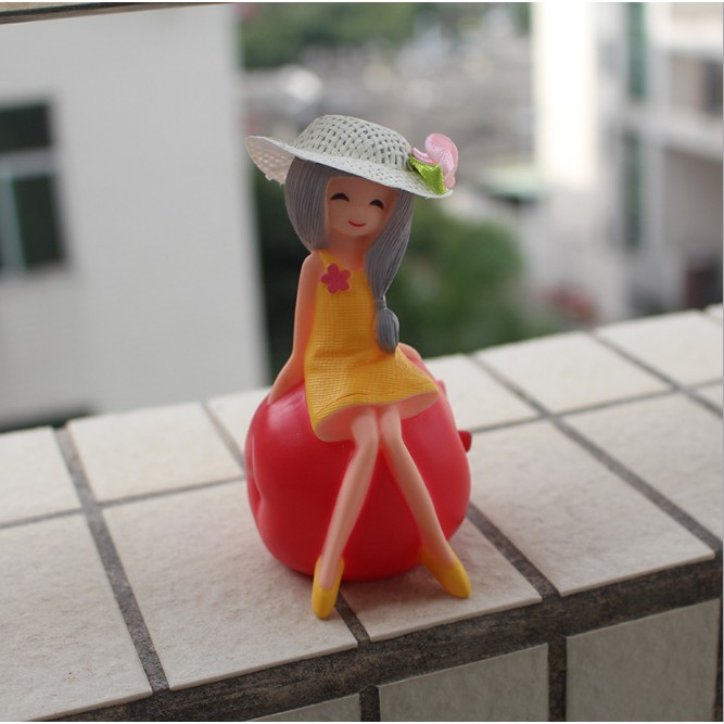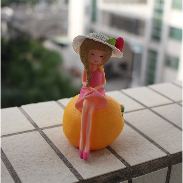 Combo gồm 04 mô hình cô nàng sành điệu ngồi trên các loại trái cây khổng lồ chuyên dùng trang trí tiểu cảnh, bonsai ....