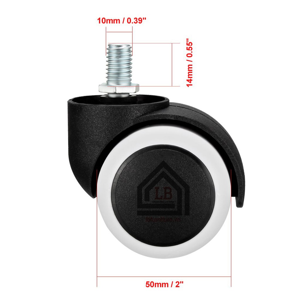 - Kích thước: Đường kính bánh xe 5cm, cao tổng thể 8cm, đầu ốc 10 ly
