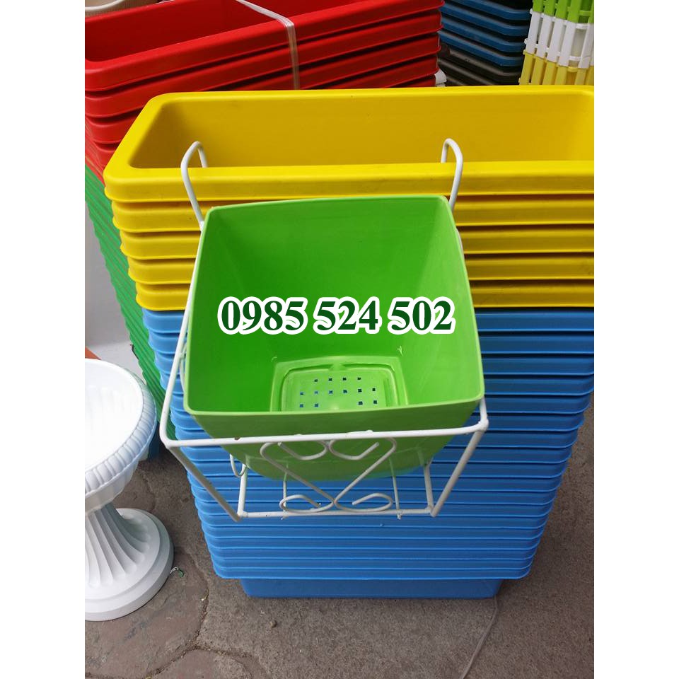 Bộ chậu nhựa móc sắt treo ban công v20Kích thước chậu cạnh gần 20cm cao gần 20cm