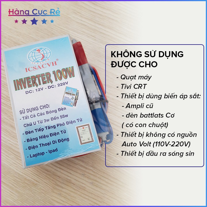 • Bộ đảo điện không sử dụng được cho quạt máy, các loại động cơ AC có tải cảm, các thiết bị dùng biến áp sắt không có Auto Volt (110V-230V) như Ampli loại cũ biến áp sắt, đèn huỳnh quang dùng battlats Cơ ( có con chuột) vì đây là các thiết bị sử dụng điện áp có ngõ ra sóng sin, thiết bị đảo điện đầu ra là sóng vuông.