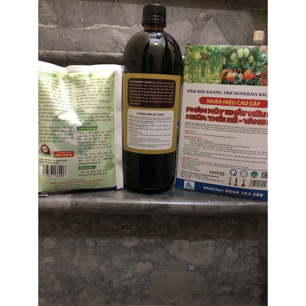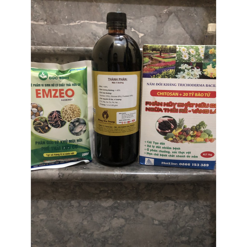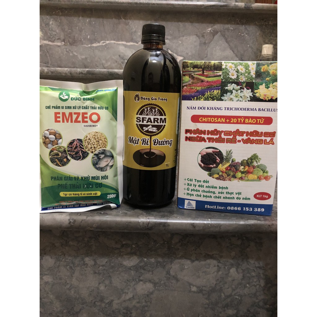 Combo 1 gói Emzeo, 1L Mật Rỉ Đường Sfarm và 1kg nấm Trichoderma để ủ phân cá, phân bón hữu cơ, rác thải nhà bếp