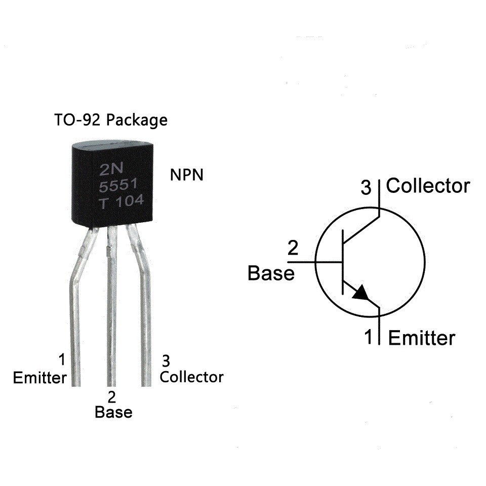 - Transistor 2N5551 có cấu tạo gồm 3 lớp bán dẫn ghép với nhau thành 2 mối nối P-N, thuộc loại transistor nghịch NPN. Transistor 2N5551 được sản xuất theo chuẩn TO92, thứ tự các chân từ trái qua phải: E B C.