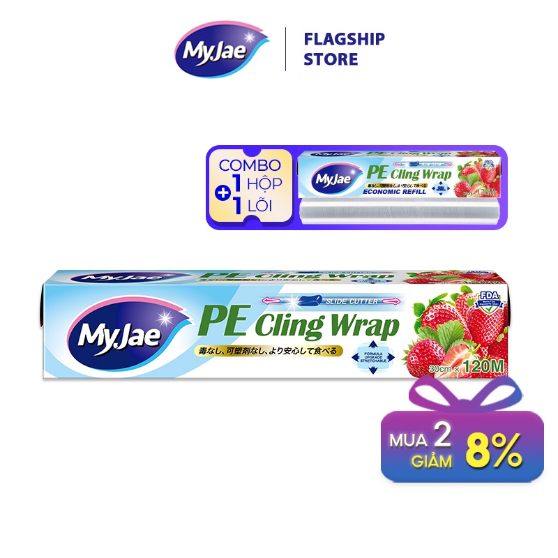 Giới thiệu Combo 1 màng bọc thực phẩm PE + 1 lõi màng bọc MyJae Đài Loan 30cm x 120m dạng dao cắt trượt bảo quản thực phẩm