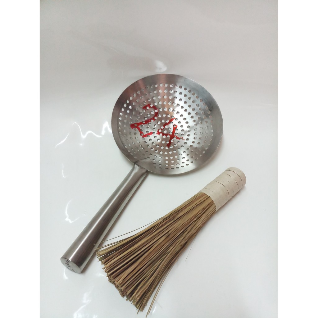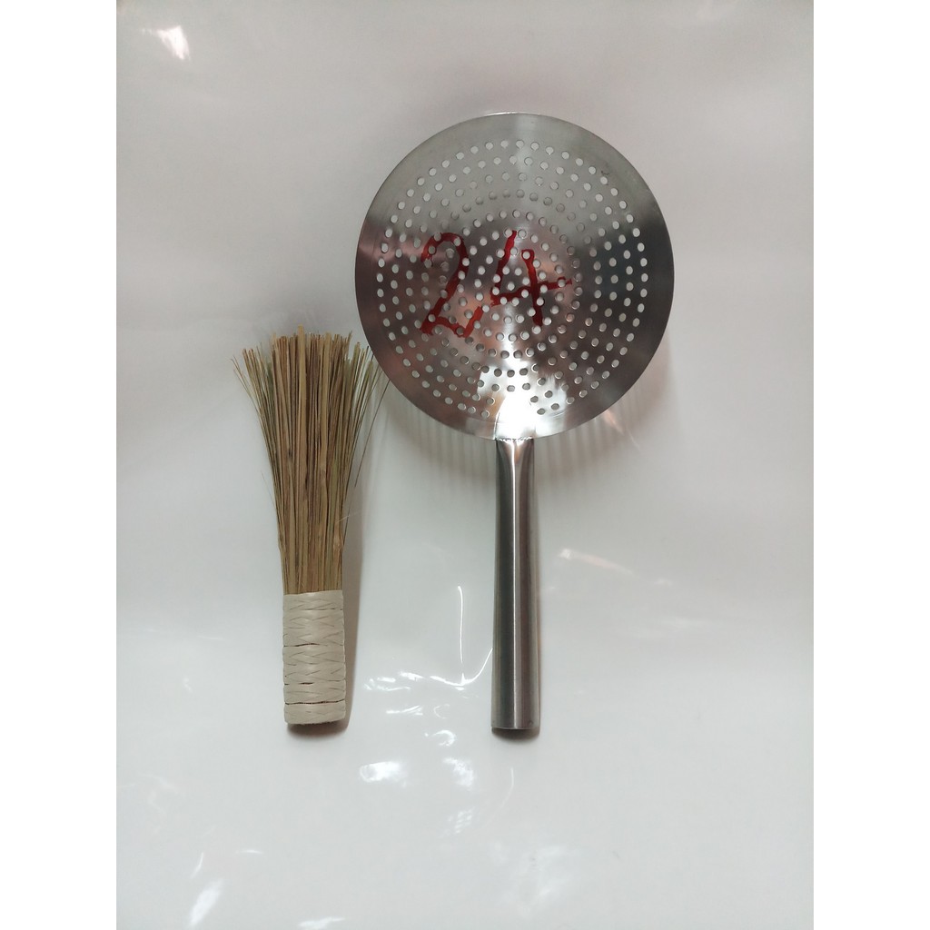 COMBO 1 VỢT LỔ 24CM INOX CÁN INOX+1 CHỔI TRE CỌ RỬA CHẢO.