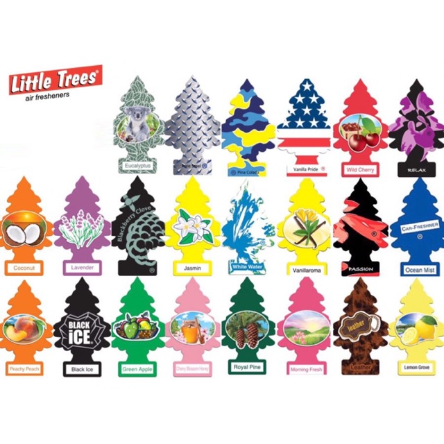 - Little Trees tại cửa hàng Sức Khỏe Xanh có 33 loại mùi khác nhau, các mùi hương như : Vani, Táo, Dâu, Chanh, và nhiều mùi hương đặc trưng khác...