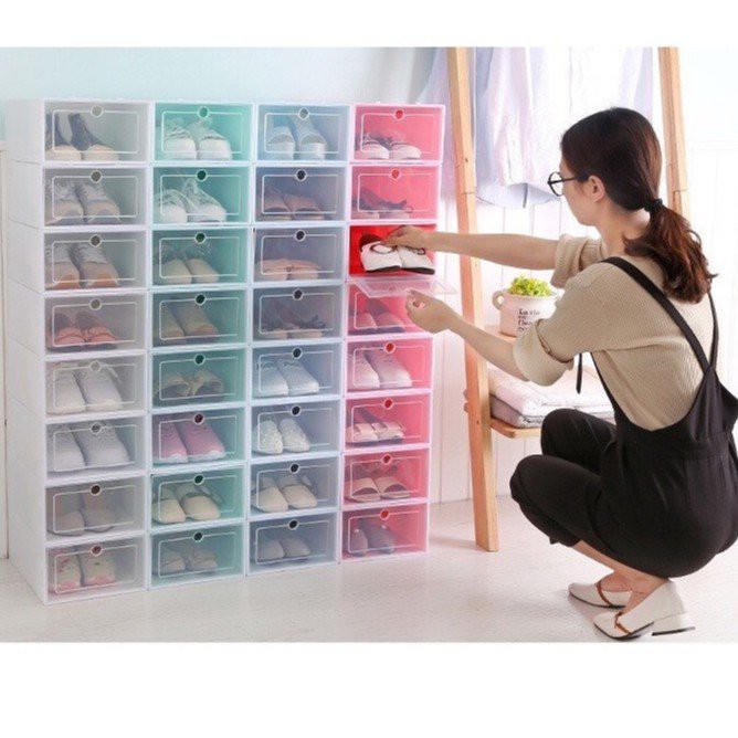 Hộp đựng giầy tiện ích có thể gập lại và xếp chồng lên nhau thành nhiều tầng.Hộp lưu trữ giầy tiện ích là thứ tuyệt vời để bạn có thể sắp xếp những đôi giầy của mình 1 cách trật tự và gọn gàng nhất. Bên cạnh đó, thân hộp được làm từ nhựa PP trong suốt giúp bạn tìm được đôi giầy ưng ý một cách dễ dàng nhất. Hộp đựng giầy có thể được làm sạch dễ dàng và thuận tiện nhất.
