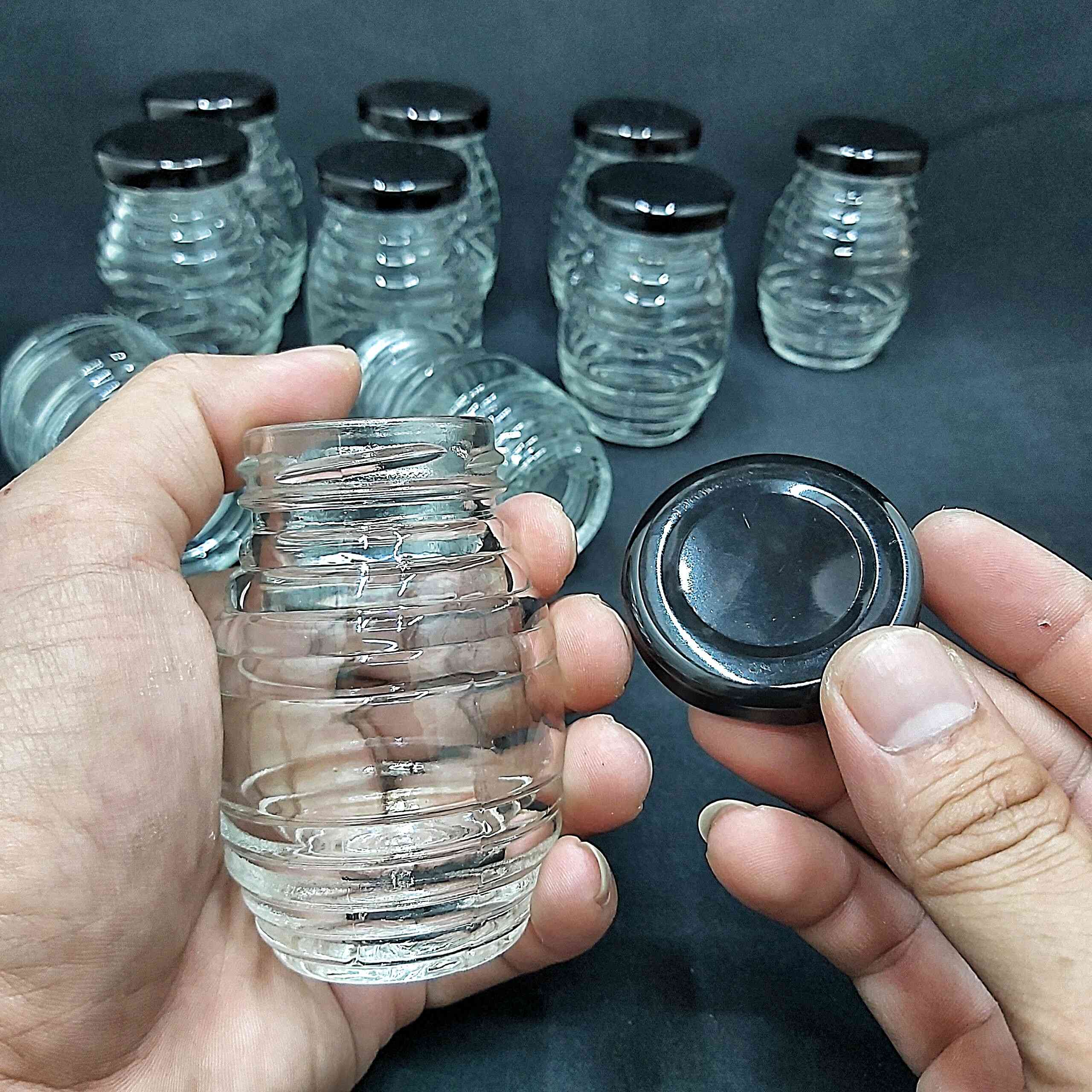 combo 10 hũ thủy tinh 100ml mẫu con ong nắp thiếc đen vặn – hủ đựng mật ong, yến chưng, gia vị, sữa chua