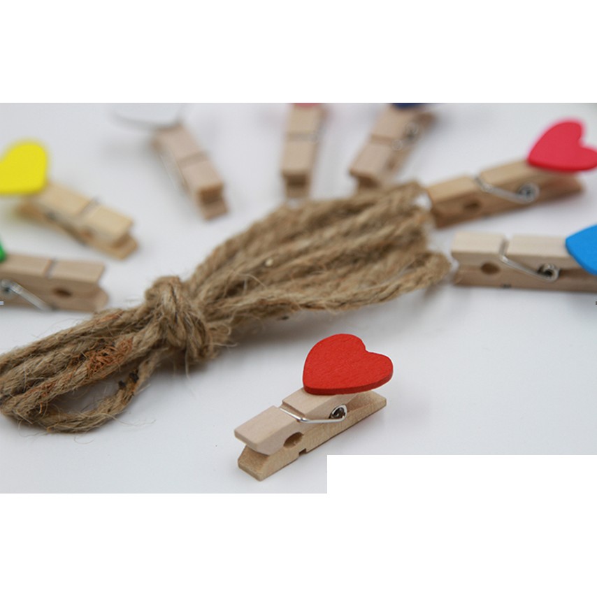 - 10 kẹp gỗ trái tím, kích thước: dài 3cm , rộng 2cm + 2m dây thừng