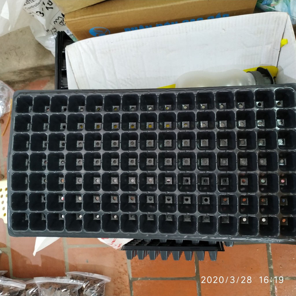 + Cho hạt giống vào từng ô một ( độ sâu gieo hạt bằng khaongr 2 lần chiều dài hạt)