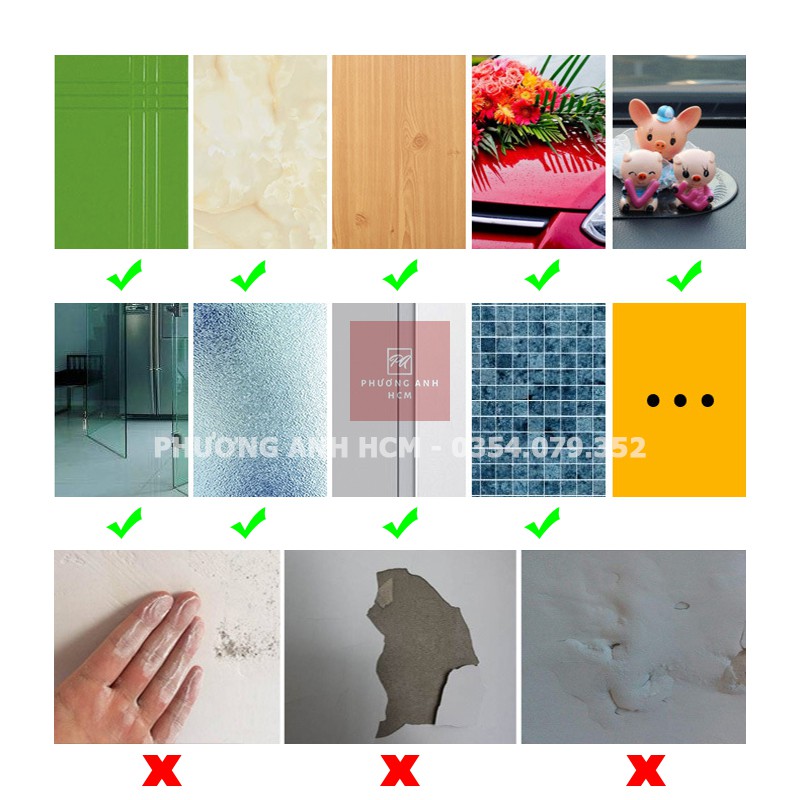 - Miếng dán chỉ dính chặt trên bề mặt láng phẳng: gạch men, kính, bề mặt tủ lạnh, mặt đá...