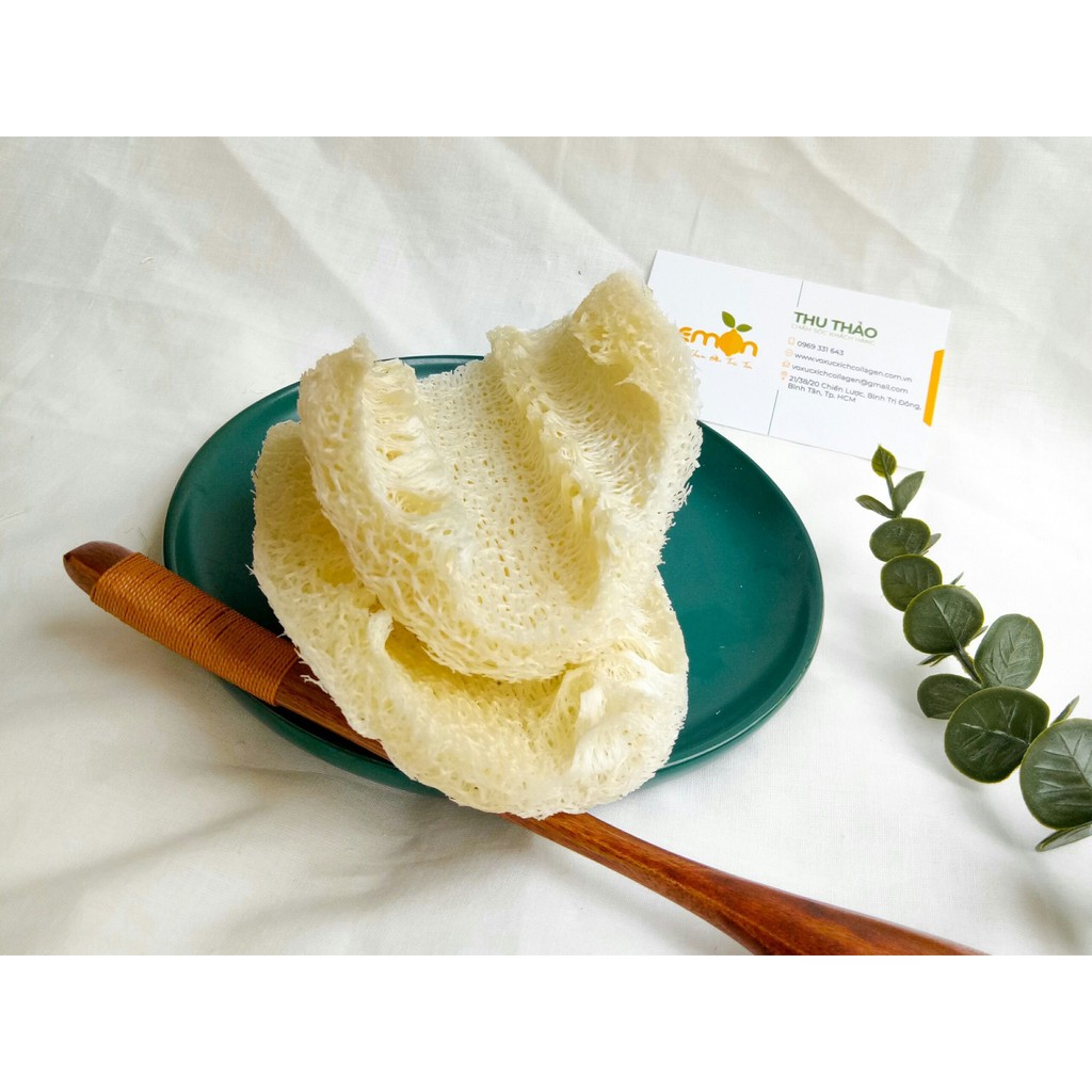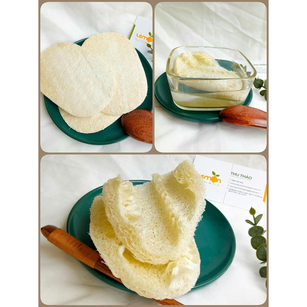 + Miếng xơ mướp khô thành phần 100% xơ mướp tự nhiên được được ép mỏng