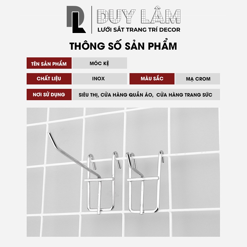 - Móc treo dễ dàng tháo lắp vào khung lưới, thay đổi vị trí linh động, thoải mái sáng tạo không gian trưng bày.
