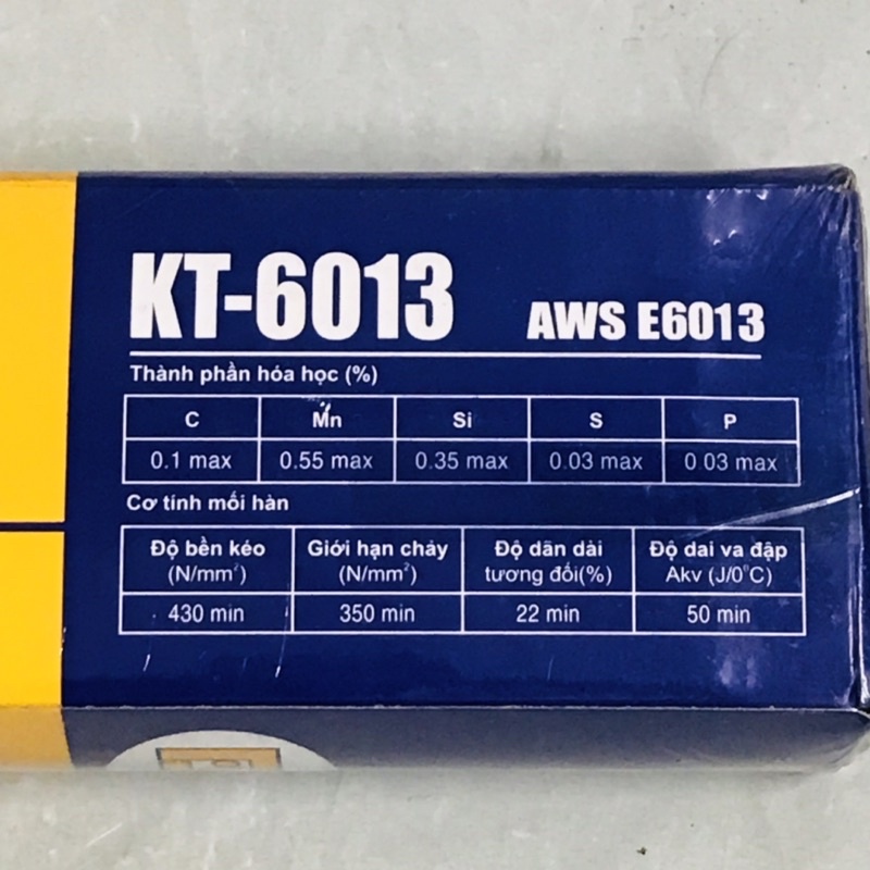 Que hàn thường (sắt) Kim Tín KT-6013 là vật liệu kết dính sắt rất tốt, được sản xuất tại Việt Nam, Que hàn KT-6013 có đường hàn tuyệt đẹp, mới hàn bền chắc, năng suất hoạt động cao, giúp cho mối hàn nhuyễn và đẹp, láng, dễ bong xỉ, nhẹ điện, ít khói và bắn toé. Có thể hàn được ở mọi vị trí. Dùng cho mối hàn thép cacbon và thép hợp kim thấp, có tải trọng trung bình.TIÊU CHUẨN: