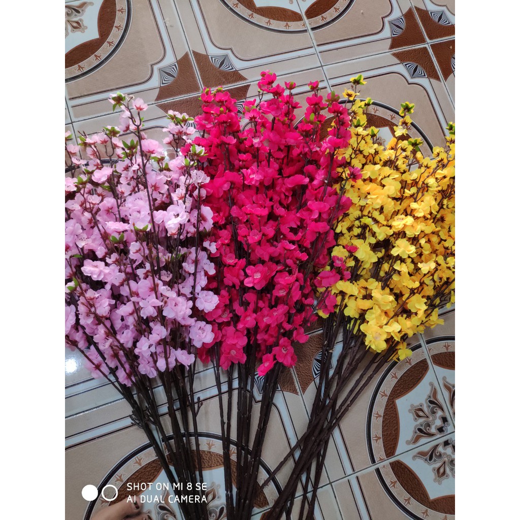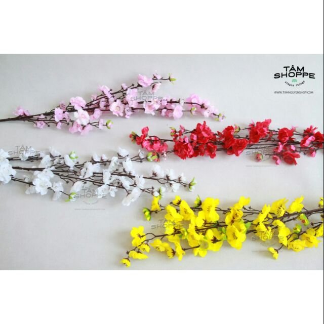 Cành dài 1 met. Có nhiều màu để các bạn lựa chọn hồng nhat. Hồng đào. Hồng đậm. Trắng sữa. Tím hồng. vàng chanh.... Thân nhựa bọc lõi thép bên trong. Hoa làm bằng lụaDùng để trang trí nhà cửa